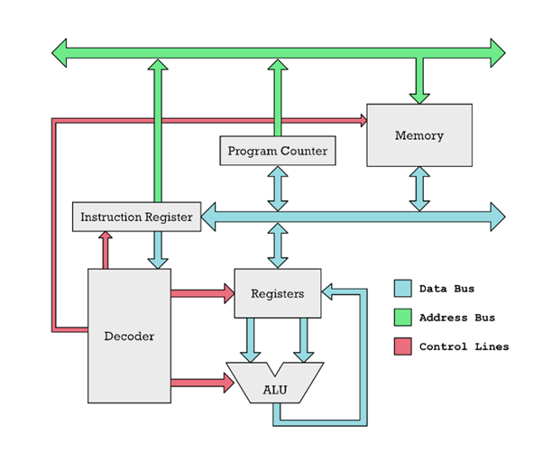 Egy nagyon egyszerű RISC CPU, nem az M1. Az utasítások a memóriából a kék nyilak mentén átkerülnek az utasításregiszterbe. Ott egy dekóder kitalálja, mi az utasítás, és a piros vezérlővonalakon keresztül engedélyezi a CPU különböző részei működését. Az ALU összeadja és kivonja a regiszterekben elhelyezett számokat.